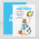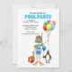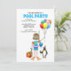 The girl and the Penguin are ready for the pool party. The girl is wearing scuba gear and holding a harpoon in her right hand while holding the birthday balloons in her left hand. The penguin is wearing a red and white striped party hat and holding a blue balloon with his right mitten.