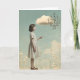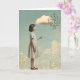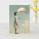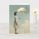 The Girl & Her Key Kite is a dreamy, surrealist greeting card that feels like a page torn from a forgotten fairy tale. A young girl in a white linen dress stands barefoot among cream wildflowers, gazing thoughtfully toward a kite made entirely of antique skeleton keys — suspended in a soft, cloud-filled sky. The muted, vintage palette of sage, ivory, and warm gold gives the image a timeless, painterly quality.