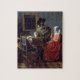The Glass of Wine by Johannes Vermeer, oil on canvas c. 1658-1660, is one of the painter’s first mature compositions with his characteristic concerns of the effects of natural light across figures and objects in an interior genre scene. A gentleman in a large, dark hat has poured a glass of wine for a smiling young woman. Light from a stained glass window bounces over the scene of warm tones contrasting with cool ultramarine blues, a coloristic theme repeated in many of the Dutch master’s later compositions.