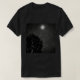 A photo of the moon and a tree with strings of lights on a foggy night, filtered and in black and white.