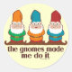 The Gnomes made me do it. 3 different coloured gnomes hanging out. Parody / spoof of The devil made me do it. 3 gnome images.