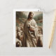 This serene depiction of Jesus as the Good Shepherd radiates peace and compassion. Central to the scene, Jesus is shown in a three-quarter view, dressed in a flowing off-white robe. His middle-aged appearance, with light brown hair, a tan complexion, and a beard, conveys warmth and humility. Holding a lamb close to His chest and a shepherd’s staff in His hand, He embodies care and guidance.