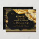 A luxurious shimmering gold silk texture draped through two wedding rings on a dramatic black background with a Deco style stripe to give the design a chic and glamourous look to customise