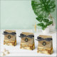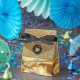 A luxurious shimmering gold silk texture draped through two wedding rings on a dramatic black background with a Deco style stripe to give the design a chic and glamourous look for a wedding thank you favour box
