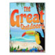 The Great Outdoors funny cartoon landscape poster of a Paradise bird Toucan on a sandy beach.