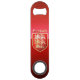 This bottle opener features three gold lions "en passant" aligned on top of each other on a red shield inspired by the Great Seal of King Richard the Lionheart.