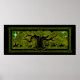 Surrounded by a border of celtic knots, a stylised, mystical forest and riders in tones of green.