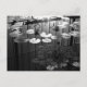 A black and white photograph of the lily pond within the greenhouse of the Shinjuku Gyoen National Garden in Tokyo, Japan.