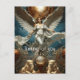 Surrealist painting of a winged angel in billowing white clothing alighting among lions with a brass abstraction of the sun and heavens above her and a city far off in the distance behind her.
