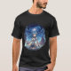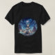 A high-fidelity anime-style illustration featuring a young mystical warrior in an epic fantasy setting. With vibrant blue hair and detailed armor in shades of silver and gold, she wields a magical staff that emanates an ethereal glow. The design is framed by a mystical circle filled with ancient runes, set against a deep night sky with a spiral galaxy and oriental temples in the background. The art combines the classic aesthetic of "Magical Girls" with RPG elements, resulting in a balanced and visually striking composition for apparel.