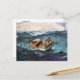 A fine art postcard with the painting, The Gulf Stream (1899), by the American artist from the realism movement Winslow Homer (1836-1910). A seascape in the Carribean with sharks swimming in the water surrounding a man struggling against the waves in a fishing boat.