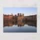 Postcard of the modern skyline of the city centre of The Hague together with historic Mauritshuis museum and the seat of government Parliament building with reflection in the still water of Hofvijver lake at dusk in The Netherlands.