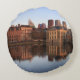 Round photo throw pillow cushion with the modern skyline of the city centre of The Hague together with historic Mauritshuis museum and the seat of government Parliament building with reflection in the still water of Hofvijver lake at dusk in The Netherlands.
