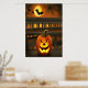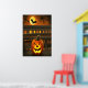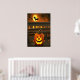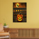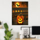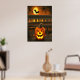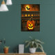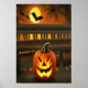 A happy smiling pumpkin standing at a bridge, a dark yellow orange sky in the background with a yellow moon and a bat flying in front of the moon. This is a AI generated art piece