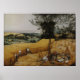 The Harvesters by Pieter Bruegel the Elder, is a 1565 oil and tempera painting on wood panel depicting Dutch farmers and peasants reaping the wheat fields of the late summer and autumn harvest season. While a group gathers around a tree for a picnic dinner, some sleep in the shade. Farmers cut grain with scythes, while others gather and bundle the harvest. The vast, panoramic Dutch landscape of fields and village is both an iconic image of Western art and a high point of Bruegel’s lifetime of landscape painting and observation of daily life, capturing both the hard life and nobility of the peasants and common people of his time.