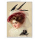 Vintage illustration of a pretty young woman in a rose coloured hat decorated with white and black hawk feathers