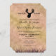 Elegant and Rustic, "The Hunt is Over" Wedding invitation. Deer trophy head silhouette at the top with words "The Hunt Is Over" surrounding him. Background is a sky gradient of pinks and light brown cream with a gradient pink to black field of grass. Buck hand drawn by ©Tina Hesskew of Fishing Hunting Life.