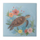 The illustration of a sea turtle gliding through clear blue water, surrounded by colorful marine life.
