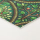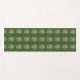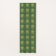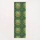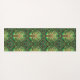 The image shows two views of a patterned yoga mat with intricate green mandala designs. The top view is vertical, and the bottom view is horizontal.