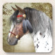 Original digital artwork by Jayne Wilson features a head portrait of an Appaloosa Indian Pony in a red bridle, with golden accents and feathers.