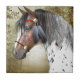 Original digital artwork by Jayne Wilson features a head portrait of an Appaloosa Indian Pony in a red bridle, with golden accents and feathers.