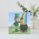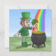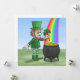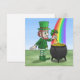 The Irish leprechaun stands at the end of the rainbow with the pot filled with gold.