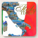 Italy filled with small postcard images and Italian flag background.