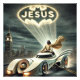 A breathtaking portrayal of Jesus driving the iconic "Jesusmobile," a sleek, futuristic white vehicle with golden accents, resembling a heavenly Batmobile. Under a glowing "Jesus" signal in the sky, He speeds through the night, embodying hope, power, and salvation. This heroic image merges modern elements with divine presence, creating a striking scene of spiritual leadership and divine intervention.