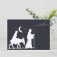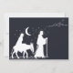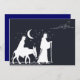 A blue and white themed Christmas invitation, featuring Mary and Joseph on their journey to Bethlehem, which is visible in the distance.