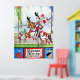 A colourful vintage mediaeval poster featuring a knight in full armour riding a horse and holding a lance.