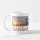 Kansas state border filled with The Keeper of the Plains sculpture by Kiowa-Comanche artist Blackbear Bosin set against a magnificent sky.