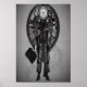 A strange looking person with strange clothing, holding a briefcase and have a clock was it's face. and has a mechanical device behind it. This is a AI generated art.