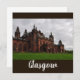 Scenic flat greeting card features a photograph of the Kelvingrove Art Gallery and Museum in Glasgow Scotland. White text overlay on brown background