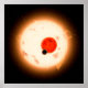 Artist's concept of the Kepler-16 system, showing the binary star being orbited by Kepler-16b. Kepler-16 orbits a slowly rotating K-dwarf that is very active with numerous star spots. Its other parent star is a small red dwarf. The planetary orbital plane is aligned within half a degree of the stellar binary orbital plane.
