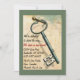 An heirloom key with a patina finish hangs from a golden spike. This vintage design makes a perfect moving announcement for your new home.