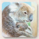 "The Koala cuddle" coaster. Artwork reproduced from original painting by Sarah Trett. Painted from photos and sketches after brief encounters with Koala's in Queensland and Victoria, Australia. Painted on hot pressed paper using acrylic paints.