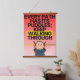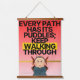A motivational tapestry design featuring the quote, "Every path has its puddle; keep walking through." The artwork blends an inspiring message with a visually striking scene of a misty pathway, where puddles reflect a golden sunrise, symbolizing resilience and perseverance. The typography is elegantly hand-brushed with a modern touch, harmonizing with a serene colour palette of blues, greys, and warm golds. Perfect for adding a touch of inspiration to any space—ideal for home décor, offices, or meditation rooms.
