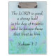 "The LORD is good, a strong hold in the day of trouble; and he knows those that trust in him." Nahum 1:7. Make this beautiful declaration of faith with this scripture text on a soft blue, pink and purple pastel floral background.