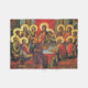 colorful painting in reds and golds of 'the last supper' by simon ushakov. jesus is at a long rectangular table with twelve apostles with golden halos. wine goblet and gold platter with bread at the table in an interior decorated with a beautiful red drape. bright bold colors and beautifully balanced painting with a lovely flow of golden halos creating a playful pattern. decorative, icon style, and painted in the seventeenth century a bright and boldly colored iconographic style painting of the new testament story of the last supper.