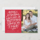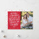 Send magical holiday greetings to friends and family with our festive photo holiday card. The phrase "The magic of Christmas never ends, its greatest gifts are family and friends" is displayed in a white hand-lettered script with a red background. Personalise the front of the cute holiday card by adding your name, year, and photo. The card reverses to feature your custom message in white text inside of a red rectangle frame. The background features a pattern of red stars and dots.
