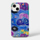 A kaleidoscope of colours forms swirling patterns and floral motifs, creating a lively visual tapestry. The use of bold blues, purples, and greens combines with striking pinks and yellows to evoke an intricate, whimsical feel. The artwork's complexity and vivid colours suggest a playful yet sophisticated design.