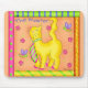 “The Master” cat is loaded with attitude and shows it by wearing a snazzy fuchsia and green striped tie. Tail and nose in the air, this cat is oblivious to the adorable bugs flying around him. Fuchsia paw prints and green dots are tossed randomly on an orange background with the text reading “The Master”. A whimsy multi-colour border surrounds the image. “The Master” yellow cat is one of 10 cats from Phyllis Dobb’s “Meow Meow” fabric collection.