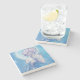 This is a drink coaster with a variation of "The Moon" artwork by Mucha. The piece is also known as "Moonlight and "Clair de Lune". The coaster is done in hues of blue. The coaster is available in a variety of shapes and materials, such as marble, sandstone, limestone, and travertine.