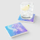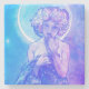 This is a drink coaster with a variation of "The Moon" artwork by Mucha. The piece is also known as "Moonlight and "Clair de Lune". The coaster is done in hues of blue, violet, and pink.