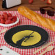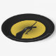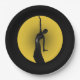 Set of eight 9” black paper plates with an image of an Art Deco female silhouetted in the bright yellow light of a full moon.
