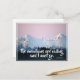 This postcard features a photograph of a snow-covered Alaskan mountain range at dusk with a beautiful pink-coloured sky. The quote by John Muir, "the mountains are calling and I must go."