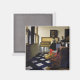 The Music Lesson by Johannes Vermeer, 1662-1665, is a carefully constructed geometric composition of a young woman standing at her virginal, taking a music lesson from a gentleman, her face reflected in the mirror above her. The richly textured interior, figures and objects recall Leonardo’s observation that objects partake of the colours of their surroundings to form an optical whole, and the three dimensional depth of the elaborate chequerboard floor likewise recalls the linear perspective of Renaissance painting.