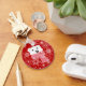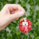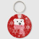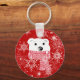 Polar bear muzzle in a red plaid scarf on a red background with white snowflakes.