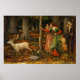 The Mystic Wood by John William Waterhouse shows a hushed autumn forest where glowing leaf litter, pale trunks, and deep shadow create a stage for quiet wonder. A white stag with branching antlers steps across the woodland floor, its brightness almost supernatural against the rust and moss. From the right, three women and a child press forward cautiously, their richly patterned garments catching pockets of light as if the forest itself is watching them. In the distance, a faint, half hidden figure deepens the sense of spell and legend, turning the scene into a moment of suspended breath where myth feels close enough to touch.