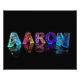 These designs are made from photographs of hand cast, hand wired, random colour change letters. The name Aaron stands reflected in still water with floating foil hexagons. The letters look as if they're carved from crackled ice, with the aurora borealis running through them. If you can't find a name you want please, get in touch, and I'll put it on my list.